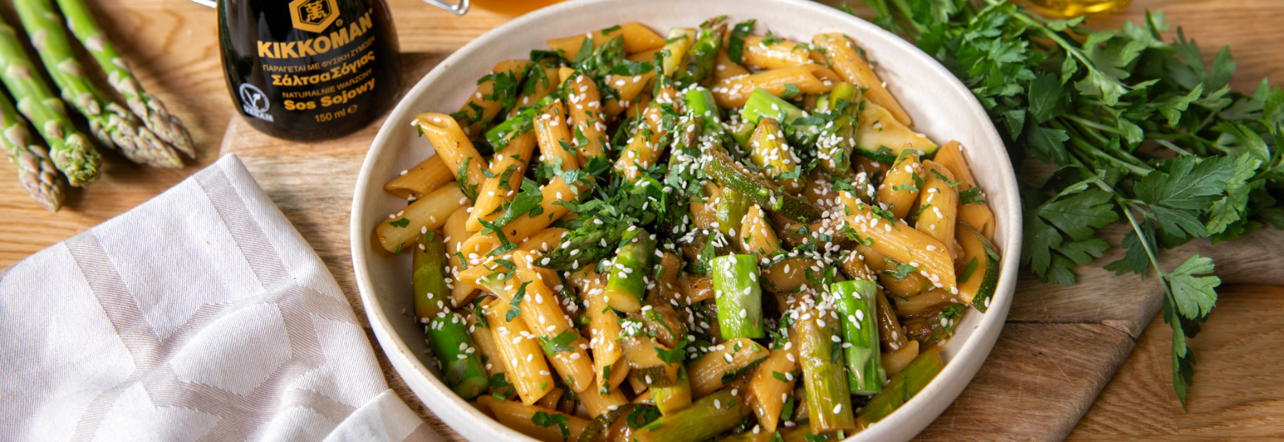 Na dużej patelni rozgrzej olej sezamowy/oliwę, wrzuć czosnek i smaż 30 sekund. Dodaj cukinię i szparagi, smaż przez 6–8 minut, aż zmiękną, ale zachowają chrupkość.