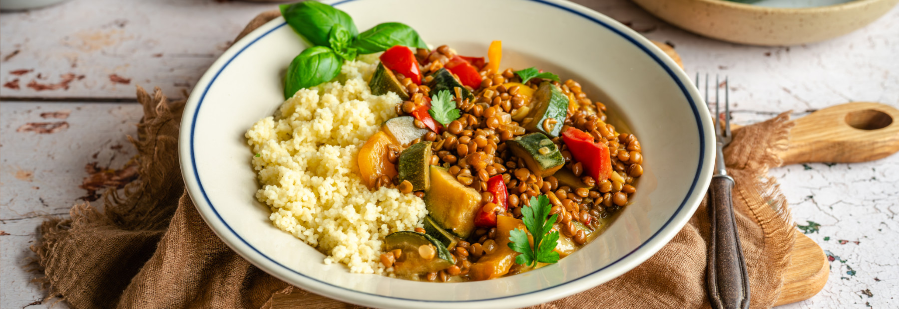 Soczewicę odsącz z płynu. Cukinię i paprykę pokrój w kostkę, cebulę w drobną kostkę i czosnek również posiekaj drobno.